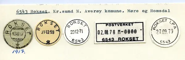 ROKSET poståpneri, på dampskipsanløpsstedet Rugset, i Kvernes herred, Romsdal amt, under Kristiansund N. postkontor, ble underholdt fra 1.10.1917 i stedet for det tidligere brevhuset Rugset. Sirk. 45, 19.9.1917.