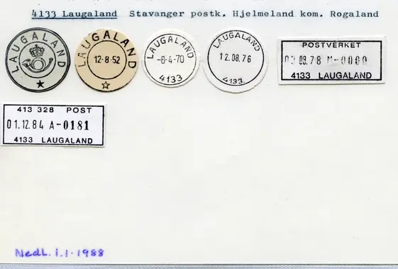 4133 LAUGALAND postkontor C ble lagt ned fra 1.1.1988. Ny postadresse: Laugaland, 4130 HJELMELAND. Sirk. 51, 28.12.1987.
