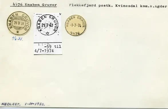 4476 KNABEN GRUVOR postkontor C ble lagt ned fra 1.11.1980. Ny postadresse: 4473 KVINLOG. Sirk. 34, 9.10.1980.
