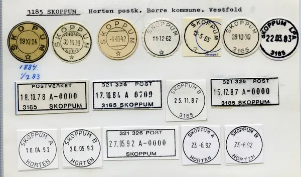 SKOPUM poståpneri, på jernbanestasjonen, i Borre prestegjeld, Jarlsberg fogderi, under Horten postkontor, ble inntil videre underholdt fra 1.7.1883. Sirk. 14, 21.6.1883.