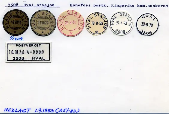 3508 HVAL STASJON postkontor C ble lagt ned fra 1.9.1983. Ny postadresse: 3500 HØNEFOSS. Sirk. 25, 9.8.1983.