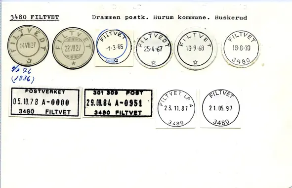 FILTVEDT poståpneri, i Filtvedtstrand, Hurum prestegjeld, Buskerud fogderi, under Drammen postktr., ble opprettet ved Kgl.res. 11.12.1875 med virksomhet fra 1.1.1876, og med ukentlig bipostrute til Hvidtsten poståpneri. Sirk. 29, 22.12.1875.
