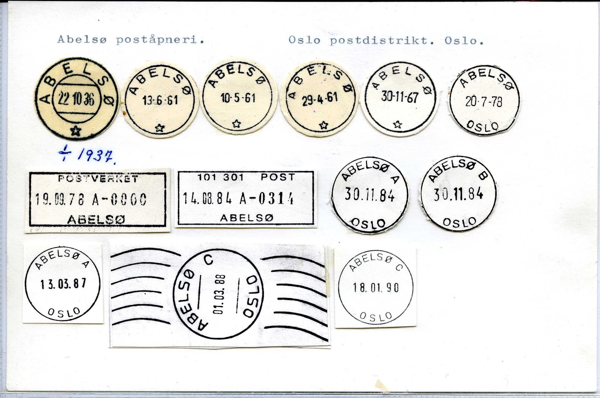 ABELSØ poståpneri, i Aker herred, Akershus fylke, under Oslo postkontor, ble opprettet 1.1.1937. Posten til/fra stedet ble pakket til Oslo. Sirk. 48, 23.12.1936.