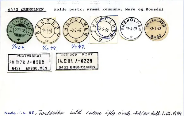 Postkontoret 6432 ERSHOLMEN i Molde postområde ble lagt ned fra 1.12.1989. Ny postadresse: 6430 BUD. Sirk. 37, 13.11.1989.