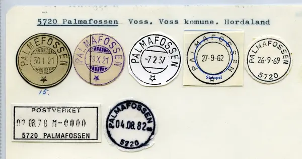 Postkontoret 5720 PALMAFOSSEN, under Voss postkontor, ble lagt ned fra 1.6.1966. Ny postadresse: 5700 VOSS. Kilde: Nedlagte postkontorer og postkontoret som har endret navn i tiden 1900--1981.