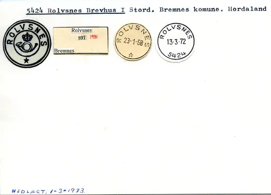 Brevhuset 5424 ROLVSNES, under Haugesund postkontor, ble lagt ned fra 1.3.1973 og erstattet med landpostrute. Sirk. 7, 1.3.1973. Ny postadresse: 5423 BRANDASUND. Kilde: Nedlagte poststeder og poststeder som har edndret navn i tiden 1900--1981.