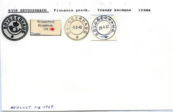 BRYGGERHAUG poståpneri i Tranøy herred, Troms fylke under Harstad postdistr. ble underholdt fra 1.9.1945 i stedet for brevhus med samme navn. Posten til/fra stedet ble sendt med landpostbudrute nr 7348 Vangsvik--Kampevoll--Sørli--Finnsnes (for tiden m. bil). Sirk. 20, 28.7. og 25, 20.9.1945.