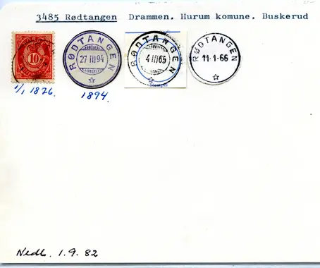 3485 RØDTANGEN postkontor C, under Drammen postkontor, ble lagt ned fra 1.9.1982. Ny postadresse: 3484 HOLMSBU. Sirk. 27, 18.8.1982.